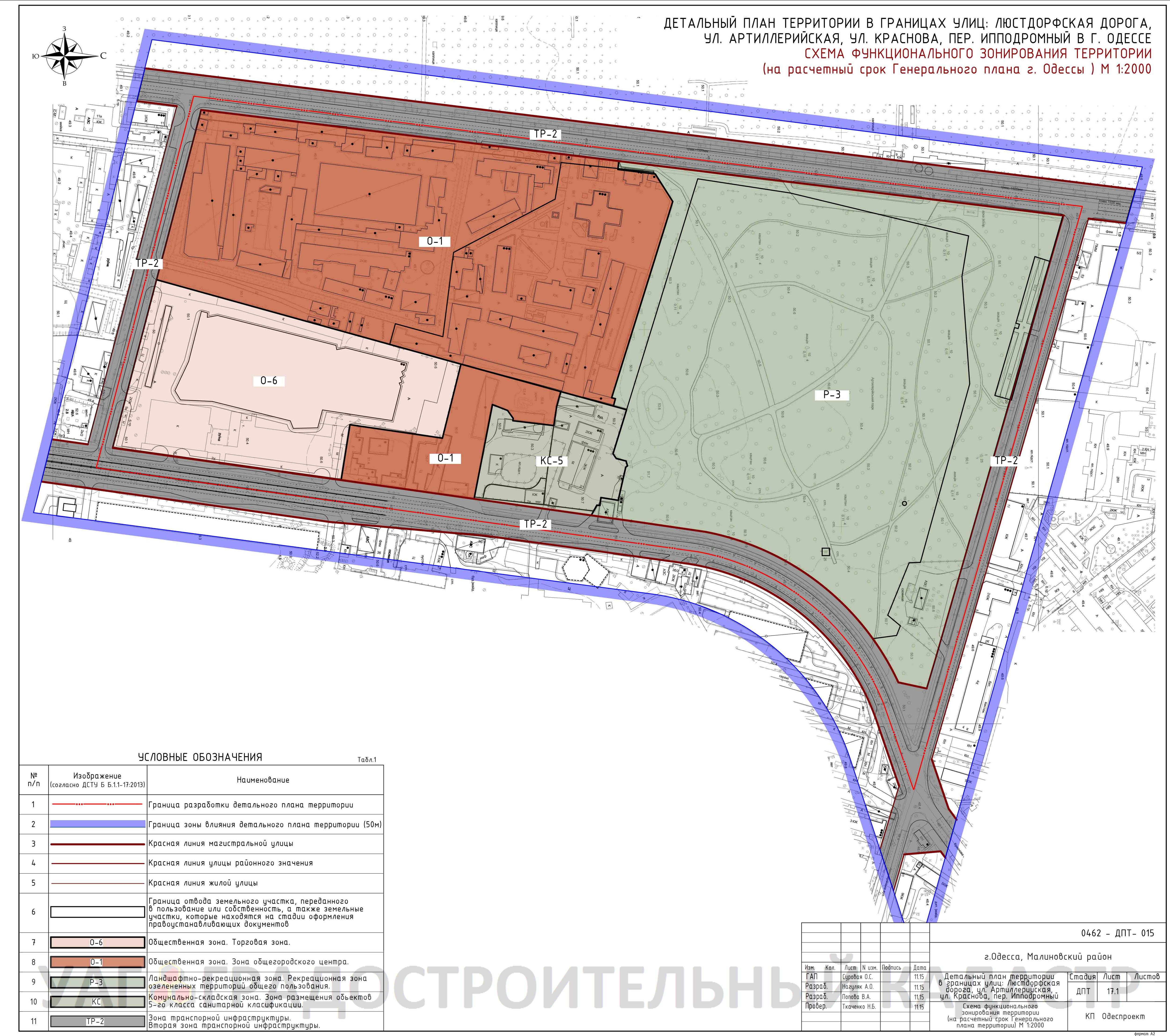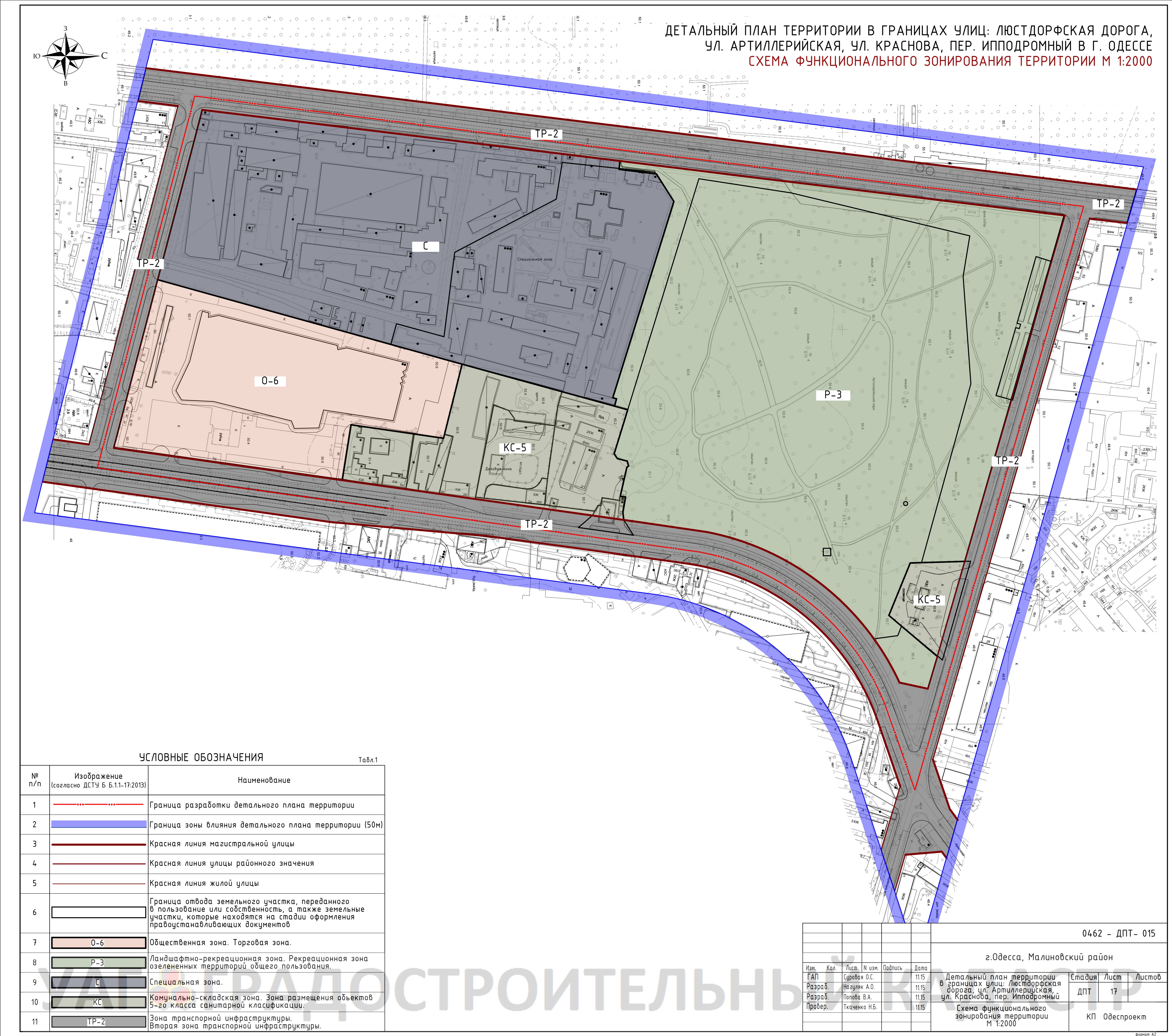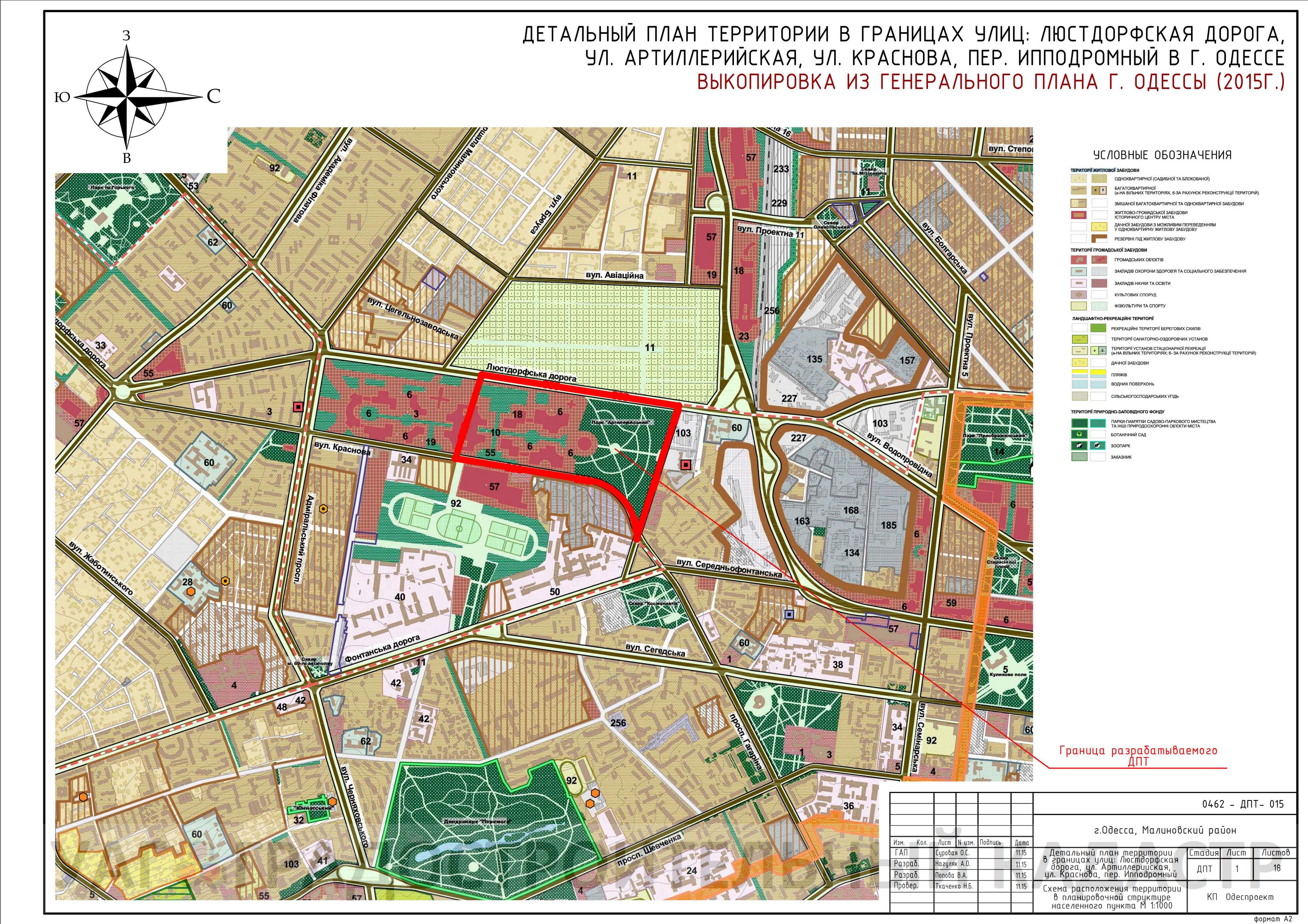 Детальный план территории в границах: Люстдорфская дорога, ул. Артиллерийская, ул. Краснова, пер. Ипподромный в г. Одессе разработан на основании решения Одесского городского совета №6941-VI от 10.09.2015г.