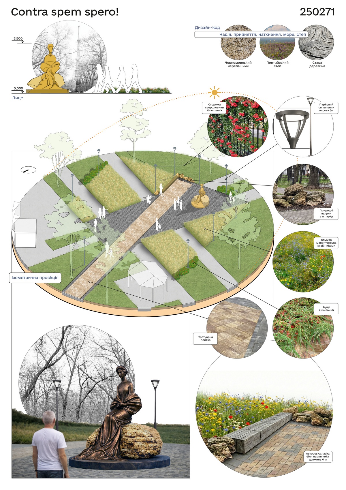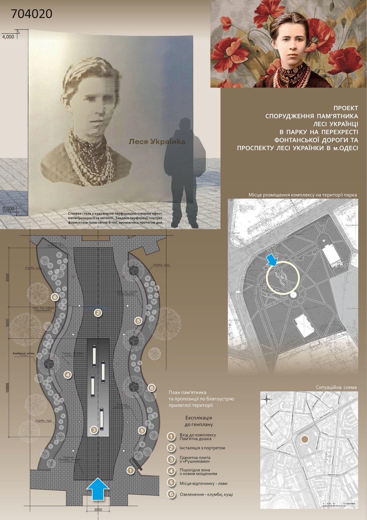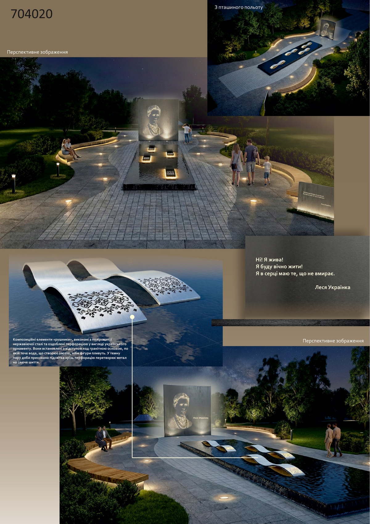 Друге місце - проєктна пропозиція під девізом №704020 (автори – скульптори Ліповка Вікторія, Рубан Олександра, архітектори Даниленко Андрій, Ліповка Катерина).